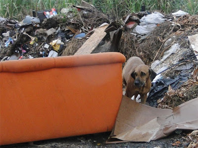 1) Cadela abandonada com móveis da casa em estrada de terra não desgruda de sofá do ex-dono.