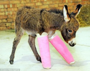 1) Burrinho prematuro ganhou moldes temporários para as pernas que não se desenvolveram completamente. Primrose usará os moldes até que consiga se locomover sozinho.