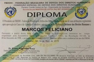1) O deputado-pastor Marco Feliciano (PSC-SP) obteve um “diploma de defensor dos direitos humanos” concedido por uma entidade sediada em Salvador que se autodenomina “Federação Brasileira dos Direitos Humanos”. O presidente do grupo se arrependeu menos de dois dias depois.
