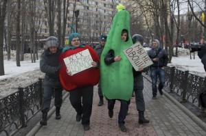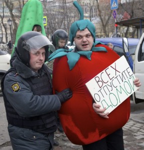 1) “Tomate” é preso na Rússia. Calma! Não há relação com o preço alto do tomate no Brasil. rs Manifestante vestido de tomate foi preso pela polícia de russa ao participar de protesto que pedia a libertação de oposicionistas do governo.Foto: Ivan Sekretarev/APFoto: Ivan Sekretarev/AP